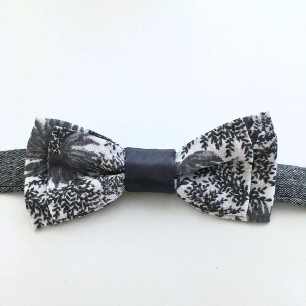 Handmade bow ties from white cotton with a grey plant print. The centre fabric is a poly-blend and has a delicate sheen to it.
