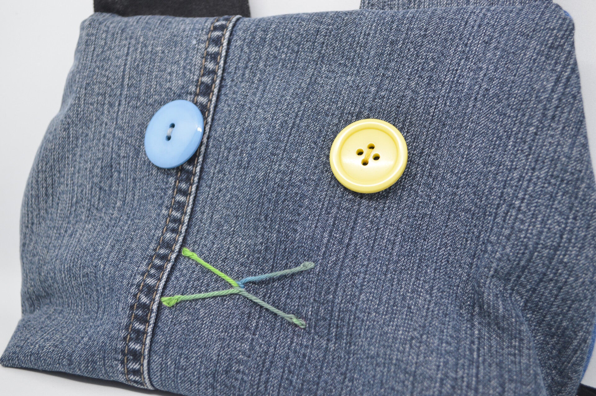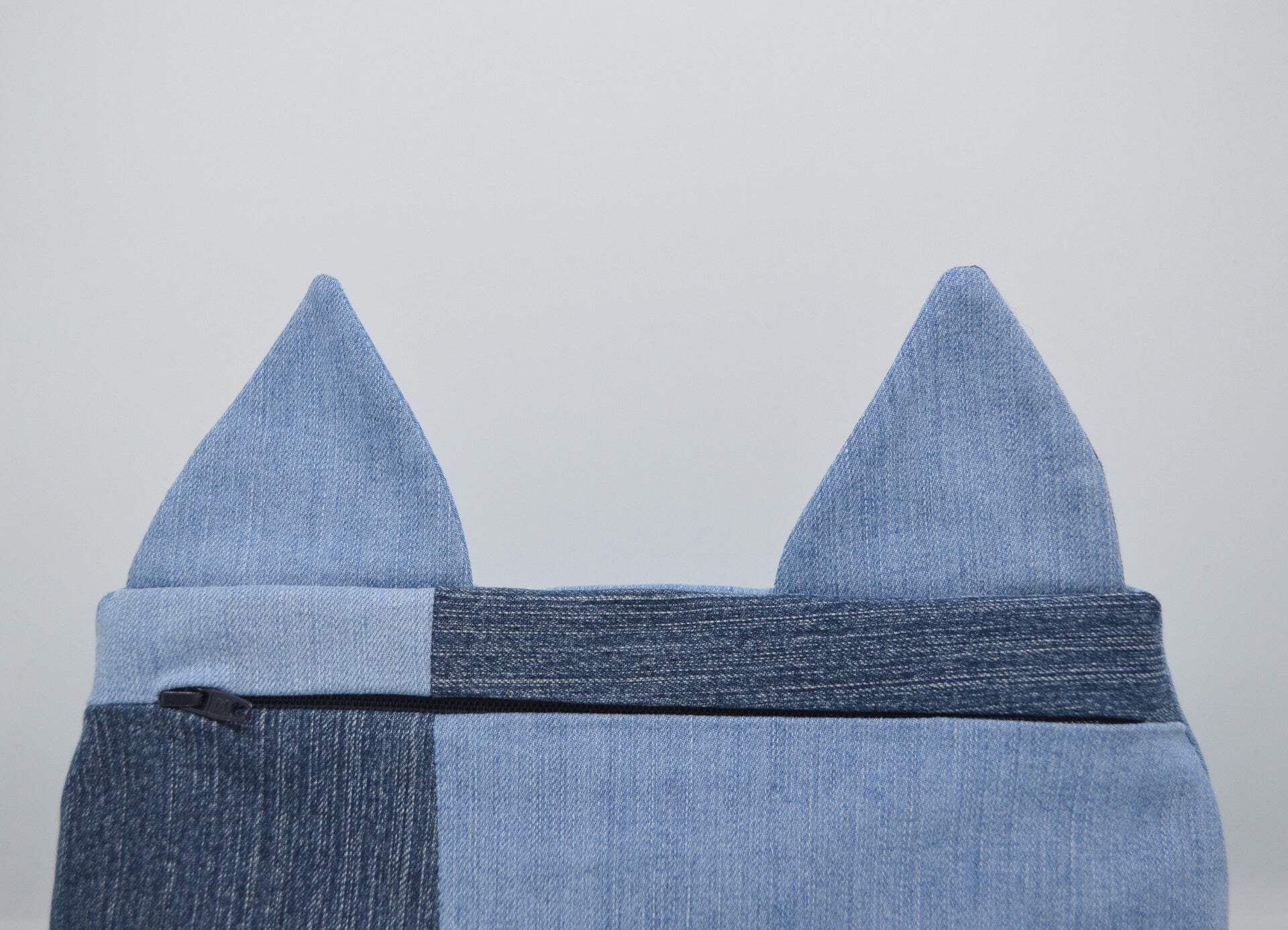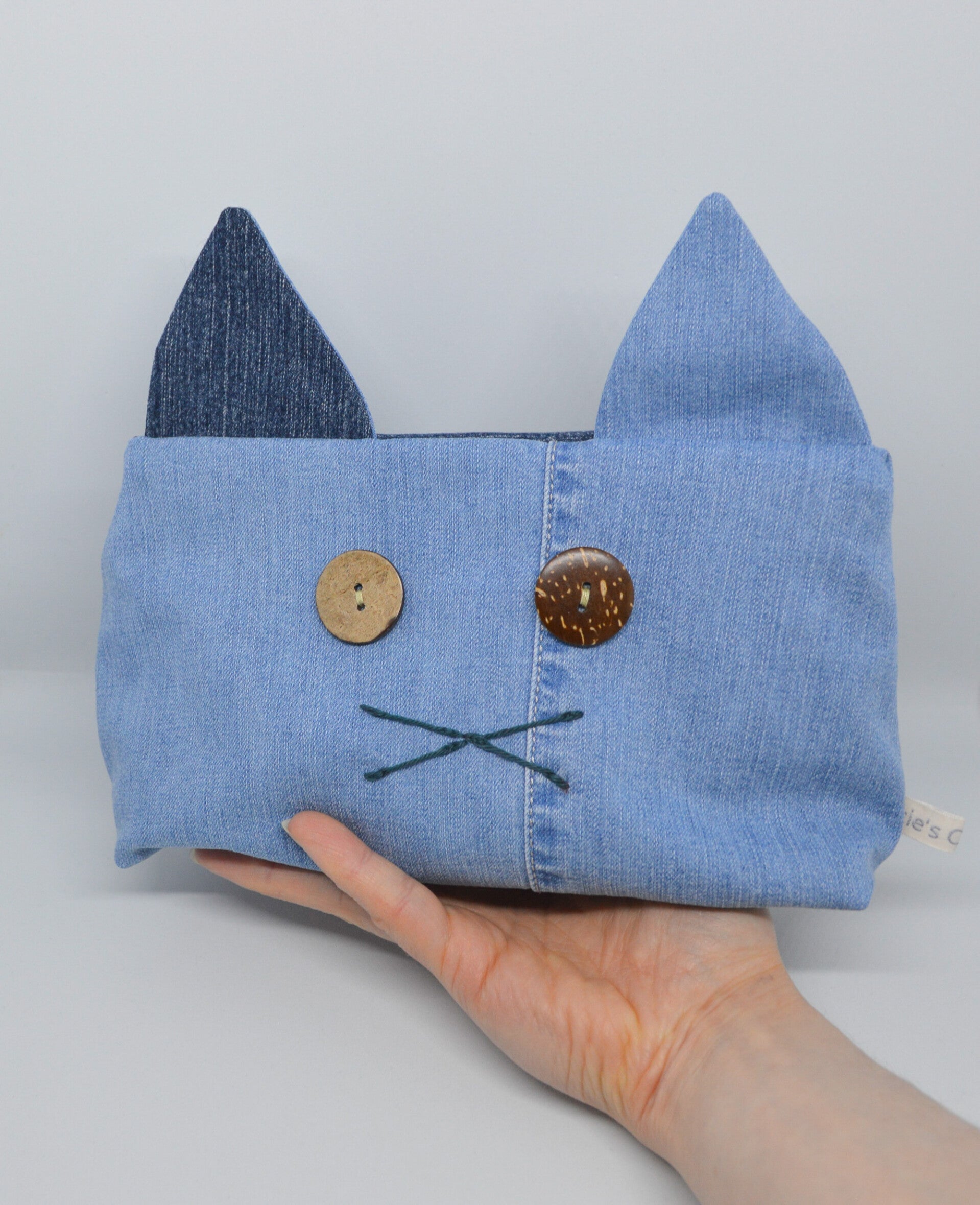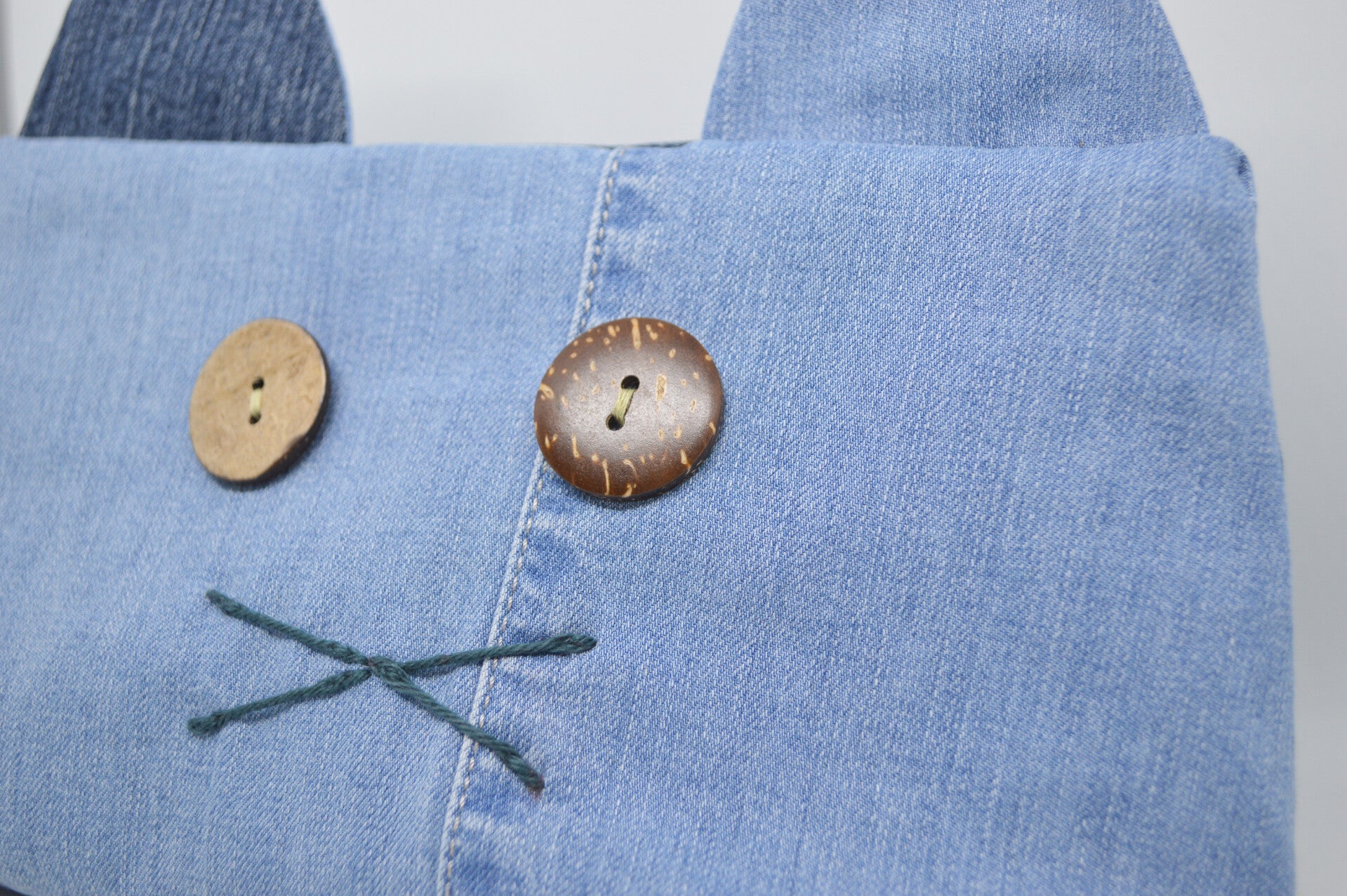 🇬🇧 These merry cat-shaped bags are handmade from old denim trousers. Mostly blue, grey and black ones but sometimes we have other colours available, too.