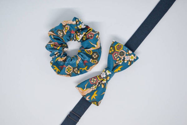 Deze vrolijke haarfroezels zijn gemaakt van petroleumblauw katoen met een Japanse kraanvogelprint.