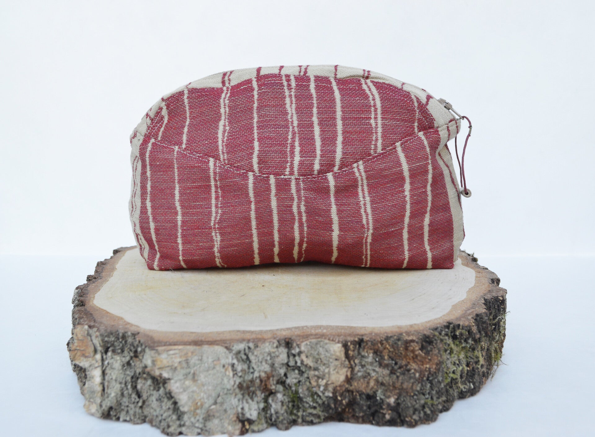 The fabric’s pattern is woven (not printed) using red and cream-coloured yarn.